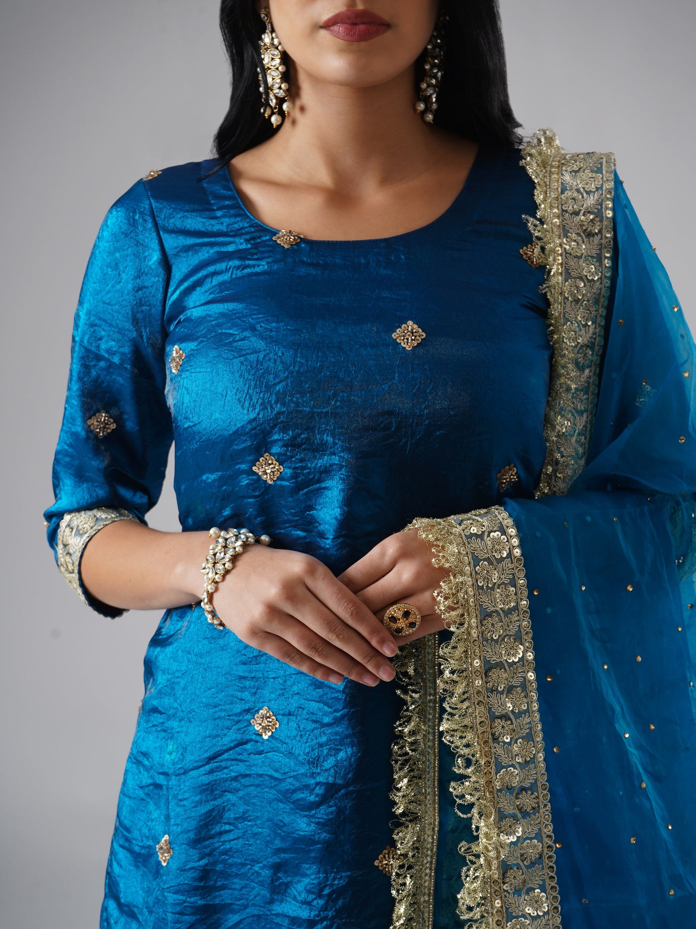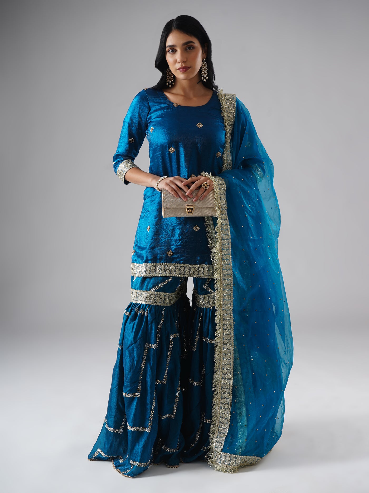 Crafted in a rich, jewel-toned Teal Sapphire, this modern gharara set features flared pants, a sleek kurta, and a light embellished dupatta. Fine sequin and cutdana detailing add a subtle sparkle, giving the outfit a festive glow without feeling heavy.