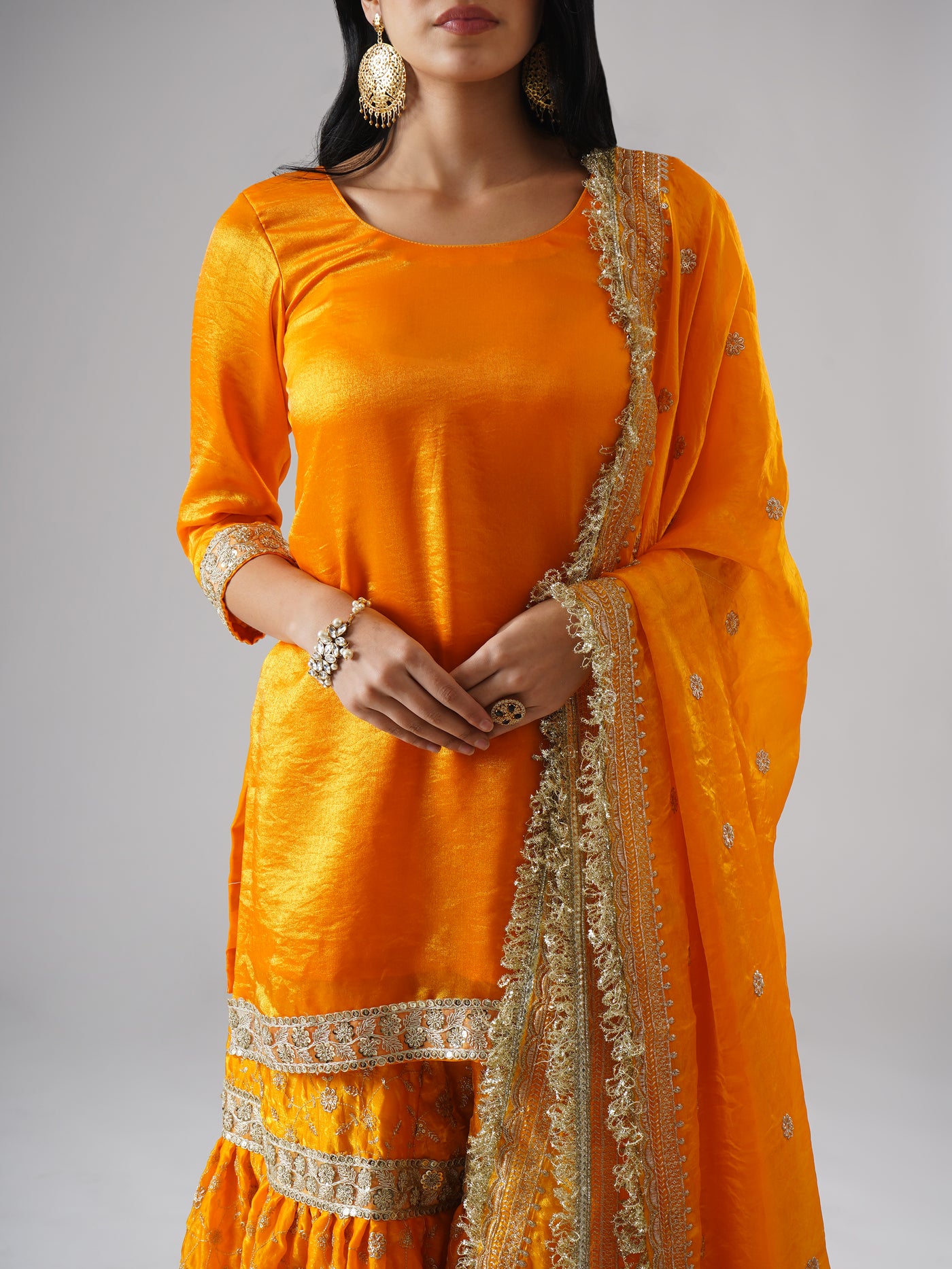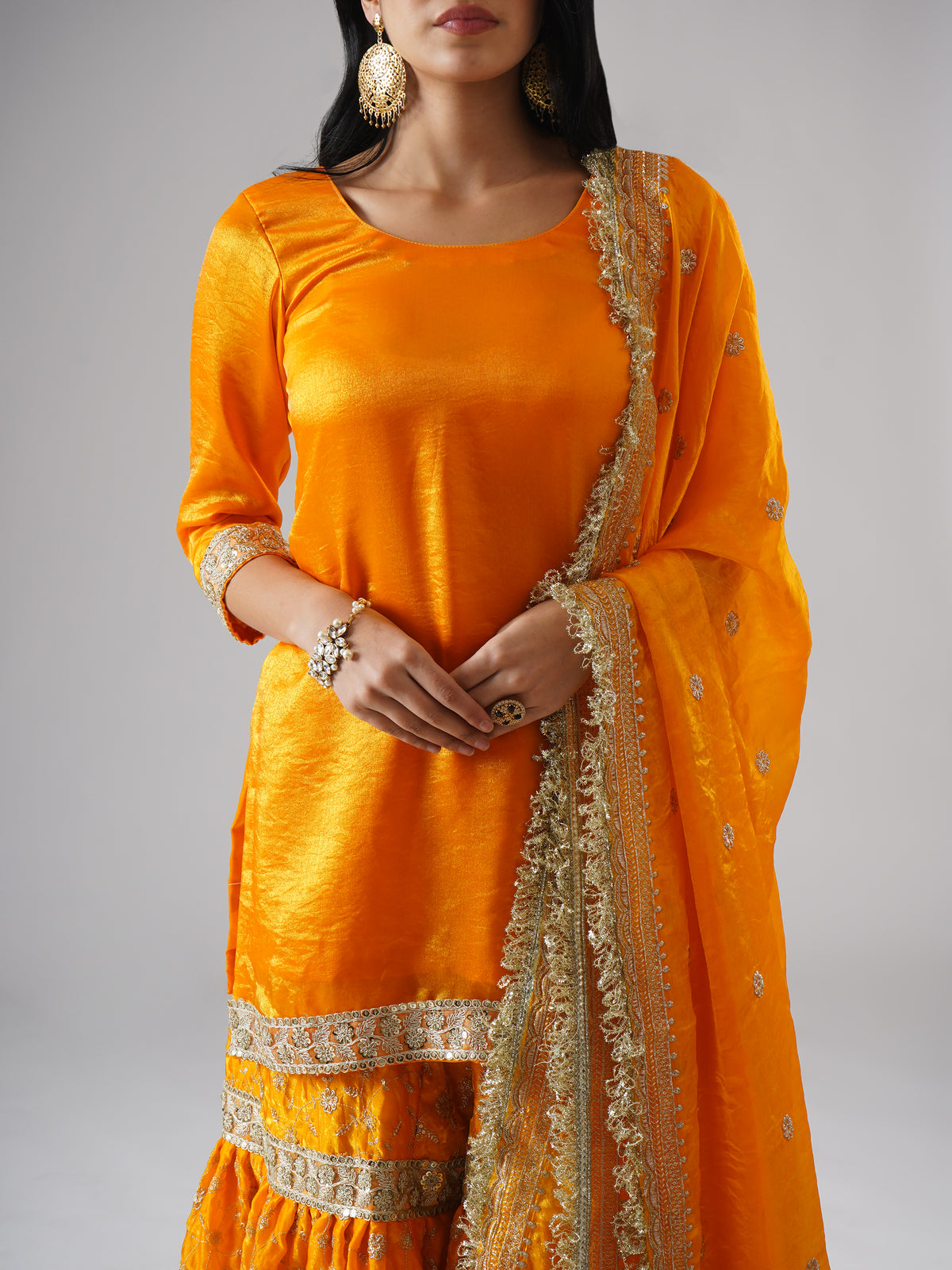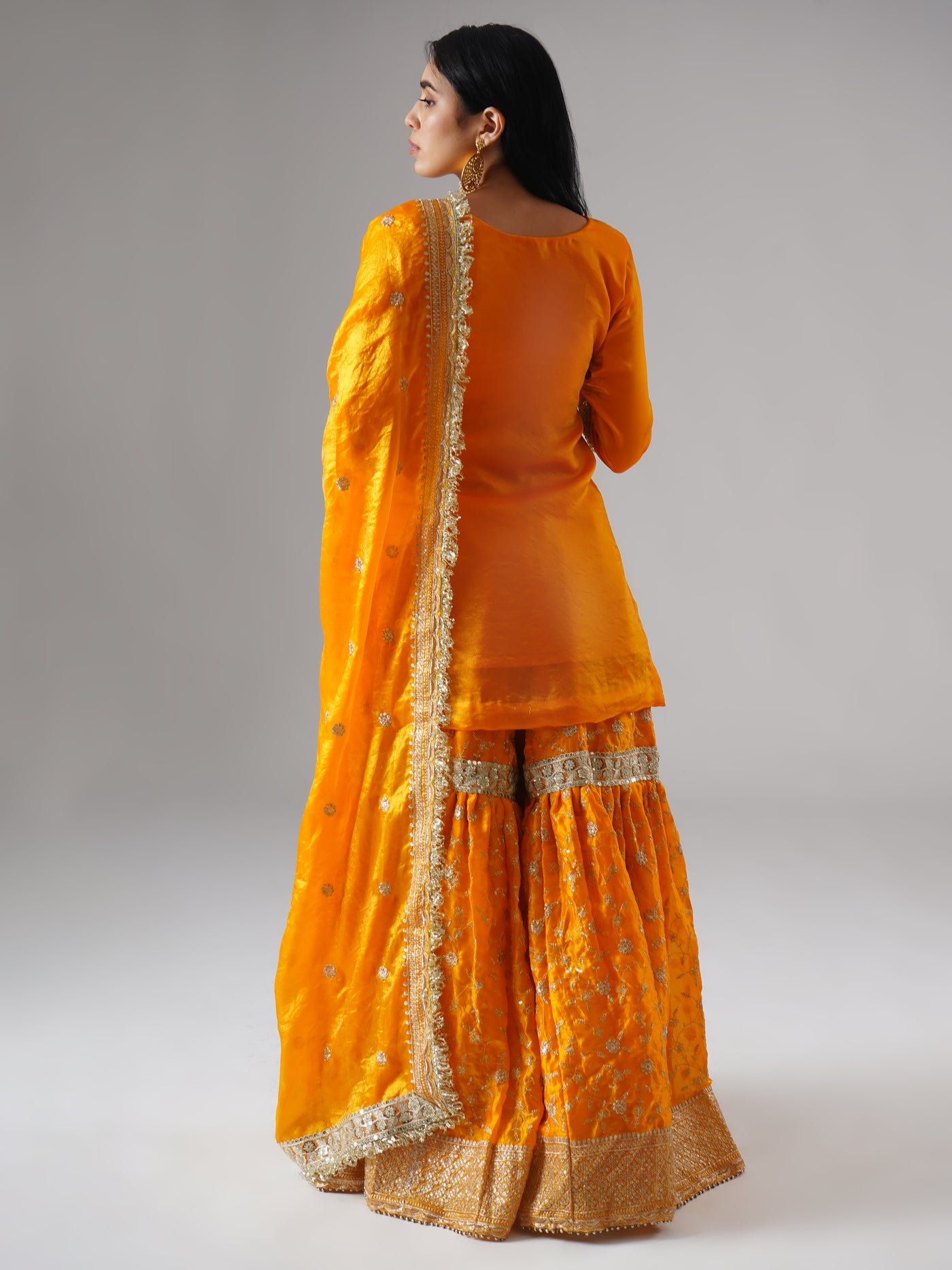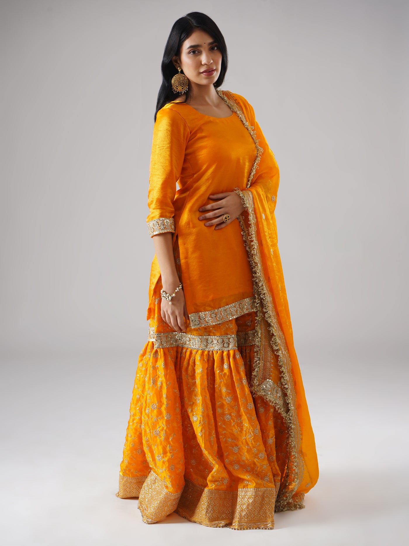 Designed in a radiant marigold-yellow hue, this modern yellow gharara set brings warmth, joy, and effortless elegance to festive moments. Crafted in a lightweight, breathable fabric, it feels easy on the body and flows beautifully, making it perfect for long celebrations without feeling heavy.