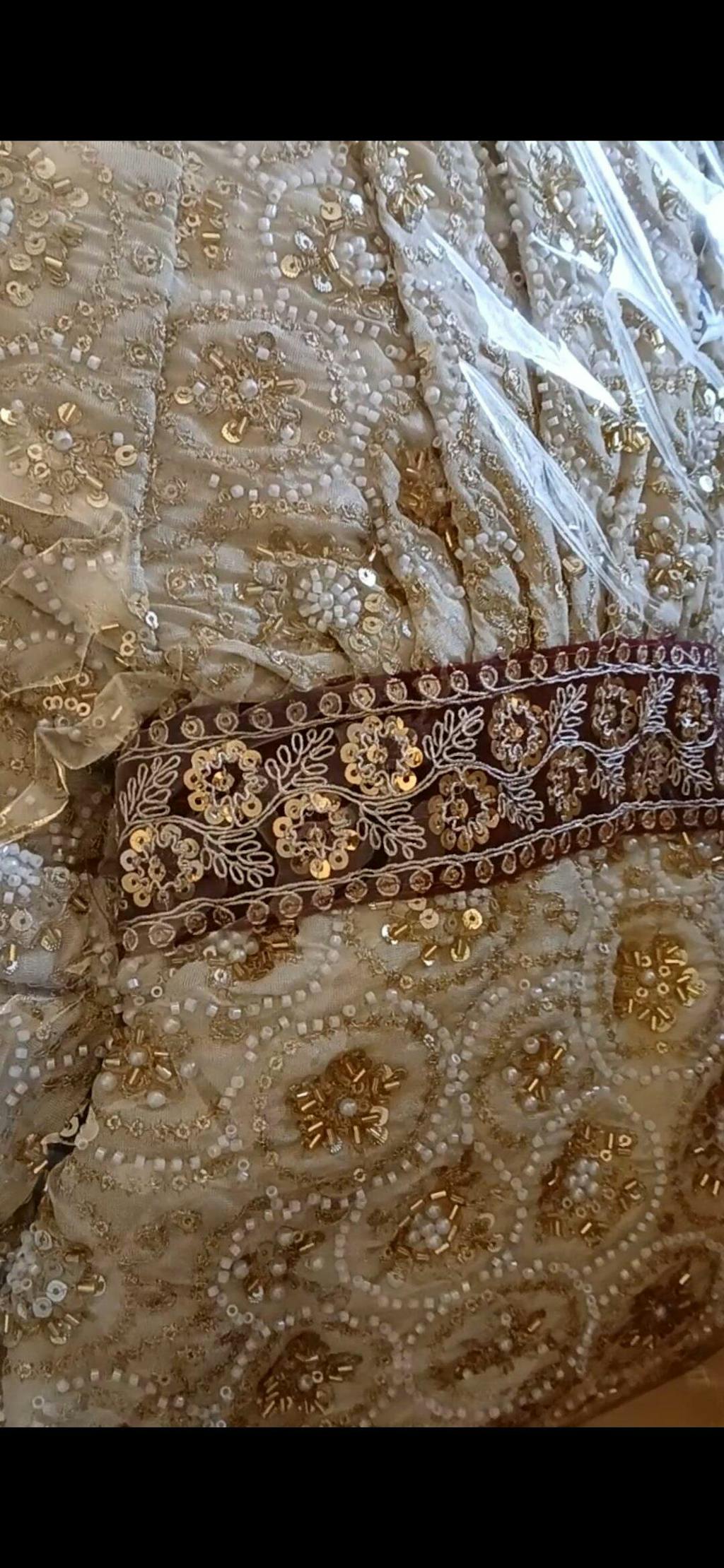 This limited-edition 3-piece bridal ensemble is crafted from premium champagne-gold tissue fabric, prized for its luminous sheen and elegant drape. The short straight kurta and wide-flared paneled gharara are intricately embroidered with sequins, pearls, and cut dana across the surface, creating a delicate golden shimmer that photographs beautifully under bridal lighting.