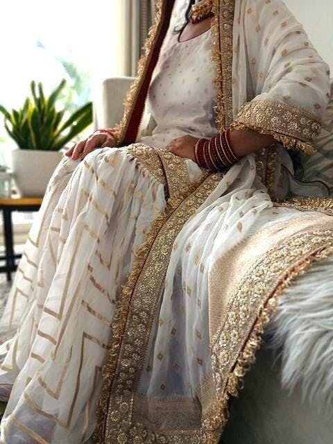 The Noor-e-Taj Gharara Set, inspired by the beauty of the Taj Mahal, blends royal charm with modern style. Made from rich yet lightweight Banarasi fabric, it features a pure white base with fine golden zari motifs and deep maroon accents that add a touch of elegance.